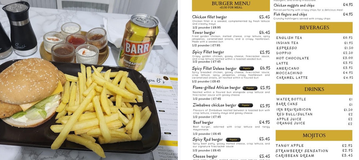 Welcome to Papa B's, your cozy culinary haven where flavors come alive! With a menu that delights every taste bud, we serve everything from succulent salmon to mouthwatering burgers, ensuring each dish is crafted with passion. Perfect for breakfast, lunch, or a quick bite, our restaurant offers a relaxed atmosphere ideal for families and solo diners alike. Enjoy warm hospitality, spacious seating, and family-friendly amenities, including kids' menus and high chairs. With convenient payment options and free parking, we cater to all your dining needs. Visit us at 39 Wellington St, Batley for an unforgettable food experience!Diners rave about the generous portion sizes, highlighting that they truly deliver value for money. Many love the Full English Breakfast, which sets the day off right with its hearty offerings. The friendly service stands out, with staff always ready to assist and make diners feel at home. The cozy decor adds to the inviting atmosphere of the diner. Furthermore, patrons appreciate the variety on the menu, ensuring that there is something to satisfy all tastes—from burgers to salmon dishes. Regular reviews praise the flavor and cooking quality, with particular mention of succulent beef burgers and the unique loaded African chicken.